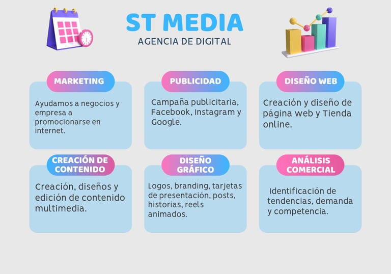 En ST Media, transformamos tu visión en estrategias efectivas que impulsan el crecimiento de tu marca. Nuestro enfoque creativo y personalizado garantiza resultados tangibles en el mundo digital.